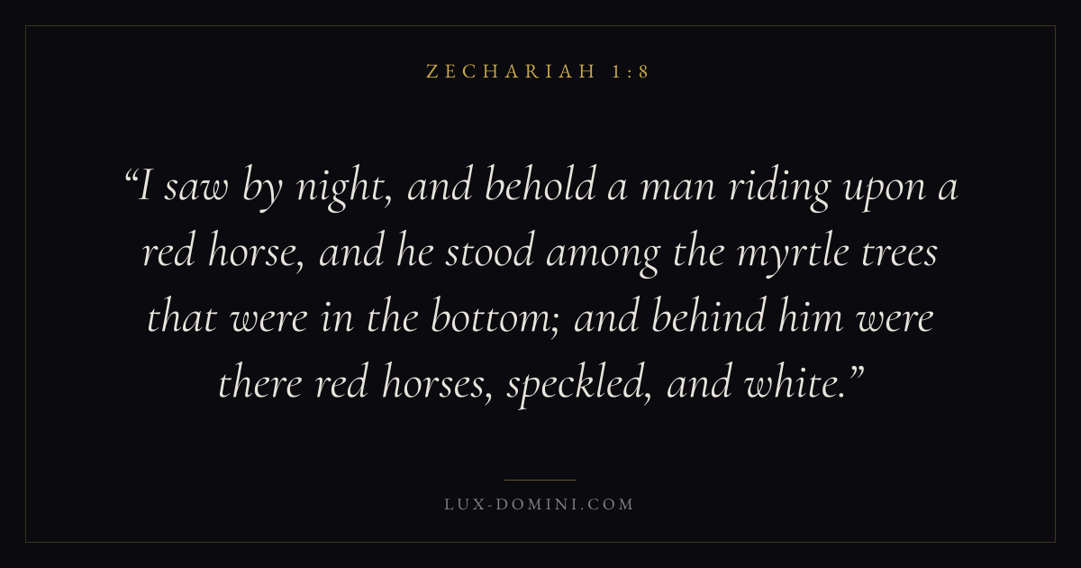 I saw by night, and behold a man riding upon a red horse, and he stood among the myrtle trees that were in the bottom; and behind him were there red horses, speckled, and white.