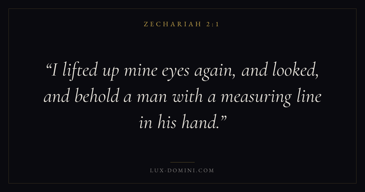 I lifted up mine eyes again, and looked, and behold a man with a measuring line in his hand.