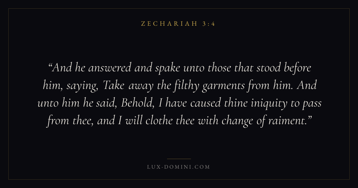 And he answered and spake unto those that stood before him, saying, Take away the filthy garments from him. And unto him he said, Behold, I have caused thine iniquity to pass from thee, and I will clothe thee with change of raiment.
