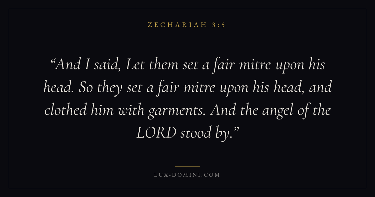 And I said, Let them set a fair mitre upon his head. So they set a fair mitre upon his head, and clothed him with garments. And the angel of the LORD stood by.