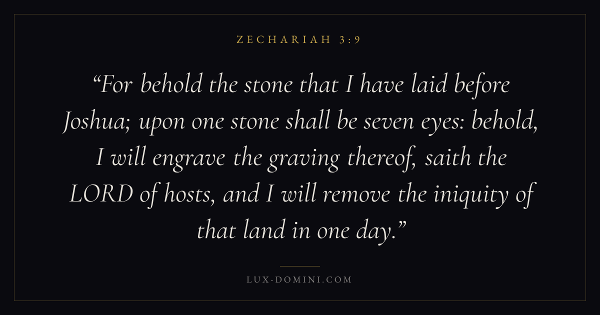 For behold the stone that I have laid before Joshua; upon one stone shall be seven eyes: behold, I will engrave the graving thereof, saith the LORD of hosts, and I will remove the iniquity of that land in one day.