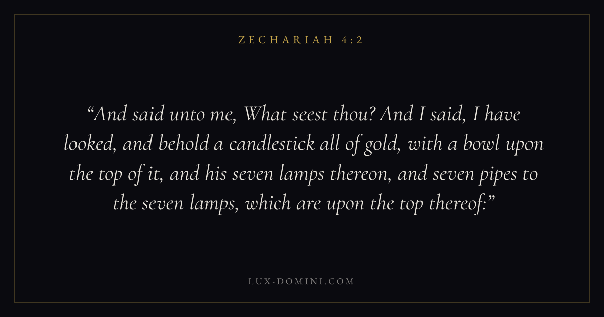 And said unto me, What seest thou? And I said, I have looked, and behold a candlestick all of gold, with a bowl upon the top of it, and his seven lamps thereon, and seven pipes to the seven lamps, which are upon the top thereof: