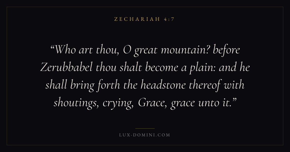 Who art thou, O great mountain? before Zerubbabel thou shalt become a plain: and he shall bring forth the headstone thereof with shoutings, crying, Grace, grace unto it.
