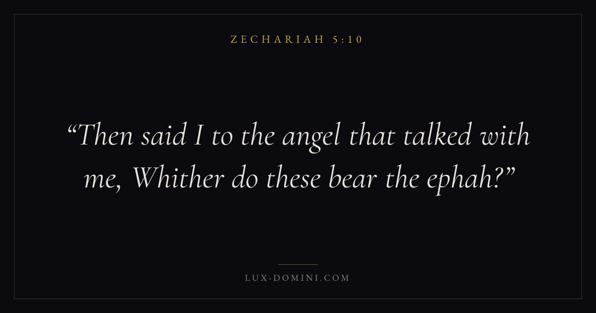 Books / Zechariah / Chapter 5 / Verse 10 ← Zechariah 5:9 Zechariah 5:10 Zechariah 5:11 → Then said I to the angel that talked with me, Whither do these bear the ephah? Download verse card Share on Twitter Share on Facebook Pin it ✦ Key themes ReturnTempleMessiahJerusalem Read with Zechariah 5:11 ✦ Zechariah Chapter 5 verses V. 1 V. 2 V. 3 V. 4 V. 5 V. 6 V. 7 V. 8 V. 9 V. 10 V. 11
