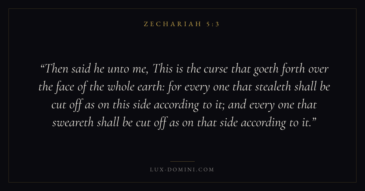 Then said he unto me, This is the curse that goeth forth over the face of the whole earth: for every one that stealeth shall be cut off as on this side according to it; and every one that sweareth shall be cut off as on that side according to it.