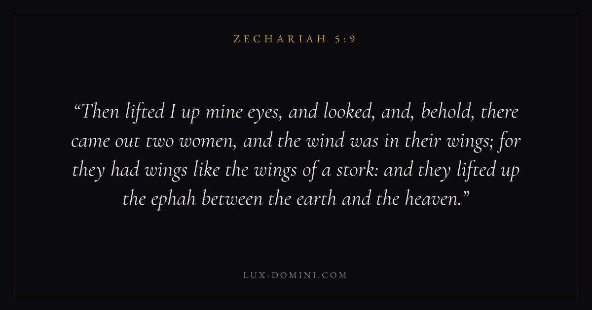 Then lifted I up mine eyes, and looked, and, behold, there came out two women, and the wind was in their wings; for they had wings like the wings of a stork: and they lifted up the ephah between the earth and the heaven.