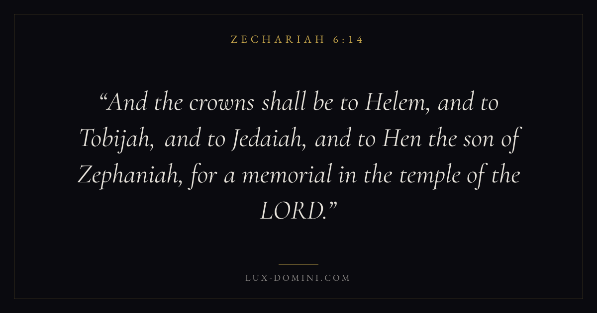 And the crowns shall be to Helem, and to Tobijah, and to Jedaiah, and to Hen the son of Zephaniah, for a memorial in the temple of the LORD.