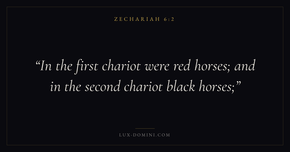 Books / Zechariah / Chapter 6 / Verse 2 ← Zechariah 6:1 Zechariah 6:2 Zechariah 6:3 → In the first chariot were red horses; and in the second chariot black horses; Download verse card Share on Twitter Share on Facebook Pin it ✦ Key themes ReturnTempleMessiahJerusalem Read with Zechariah 6:1Zechariah 6:3 ✦ Zechariah Chapter 6 verses V. 1 V. 2 V. 3 V. 4 V. 5 V. 6 V. 7 V. 8 V. 9 V. 10 V. 11 V. 12 V. 13 V. 14 V. 15