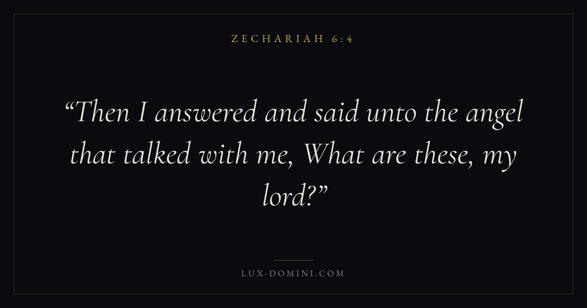 Books / Zechariah / Chapter 6 / Verse 4 ← Zechariah 6:3 Zechariah 6:4 Zechariah 6:5 → Then I answered and said unto the angel that talked with me, What are these, my lord? Download verse card Share on Twitter Share on Facebook Pin it ✦ Key themes ReturnTempleMessiahJerusalem Read with Zechariah 6:1Zechariah 6:2 ✦ Zechariah Chapter 6 verses V. 1 V. 2 V. 3 V. 4 V. 5 V. 6 V. 7 V. 8 V. 9 V. 10 V. 11 V. 12 V. 13 V. 14 V. 15