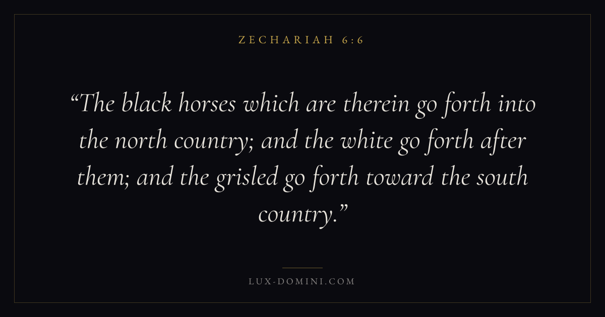 The black horses which are therein go forth into the north country; and the white go forth after them; and the grisled go forth toward the south country.