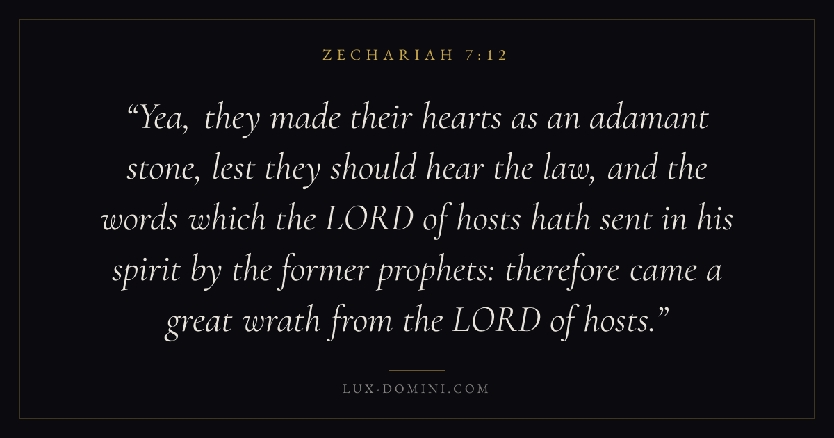 Yea, they made their hearts as an adamant stone, lest they should hear the law, and the words which the LORD of hosts hath sent in his spirit by the former prophets: therefore came a great wrath from the LORD of hosts.