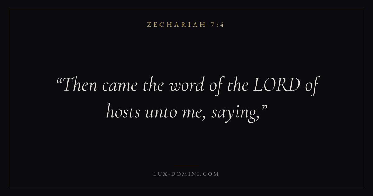Books / Zechariah / Chapter 7 / Verse 4 ← Zechariah 7:3 Zechariah 7:4 Zechariah 7:5 → Then came the word of the LORD of hosts unto me, saying, Download verse card Share on Twitter Share on Facebook Pin it ✦ Key themes PrayerTruthReturnTemple Read with Zechariah 7:5Zechariah 7:6Matthew 6:9Luke 18:1 Related topics Bible verses about prayerBible verses about truth ✦ Zechariah Chapter 7 verses V. 1 V. 2 V. 3 V. 4 V. 5 V. 6 V. 7 V. 8 V. 9 V. 10 V. 11 V. 12 V. 13 V. 14