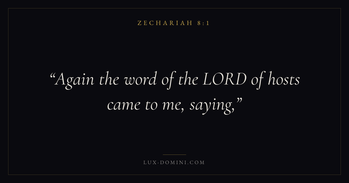 Books / Zechariah / Chapter 8 / Verse 1 ← Zechariah 7:14 Zechariah 8:1 Zechariah 8:2 → Again the word of the LORD of hosts came to me, saying, Download verse card Share on Twitter Share on Facebook Pin it ✦ Key themes TruthReturnTempleMessiah Read with Zechariah 8:2Zechariah 8:3John 14:6John 8:32 Related topics Bible verses about truth ✦ Zechariah Chapter 8 verses V. 1 V. 2 V. 3 V. 4 V. 5 V. 6 V. 7 V. 8 V. 9 V. 10 V. 11 V. 12 V. 13 V. 14 V. 15 V. 16 V. 17 V. 18 V. 19 V. 20 V. 21 V. 22 V. 23