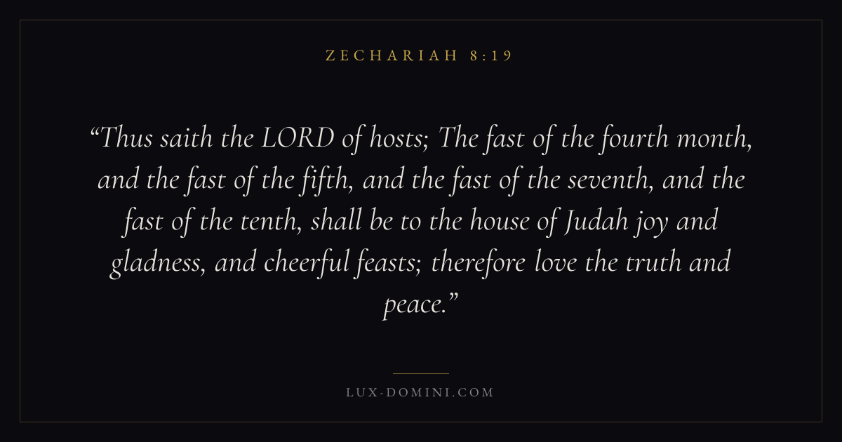 Thus saith the LORD of hosts; The fast of the fourth month, and the fast of the fifth, and the fast of the seventh, and the fast of the tenth, shall be to the house of Judah joy and gladness, and cheerful feasts; therefore love the truth and peace.