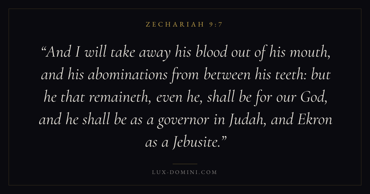 And I will take away his blood out of his mouth, and his abominations from between his teeth: but he that remaineth, even he, shall be for our God, and he shall be as a governor in Judah, and Ekron as a Jebusite.
