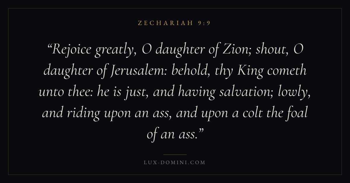 Rejoice greatly, O daughter of Zion; shout, O daughter of Jerusalem: behold, thy King cometh unto thee: he is just, and having salvation; lowly, and riding upon an ass, and upon a colt the foal of an ass.