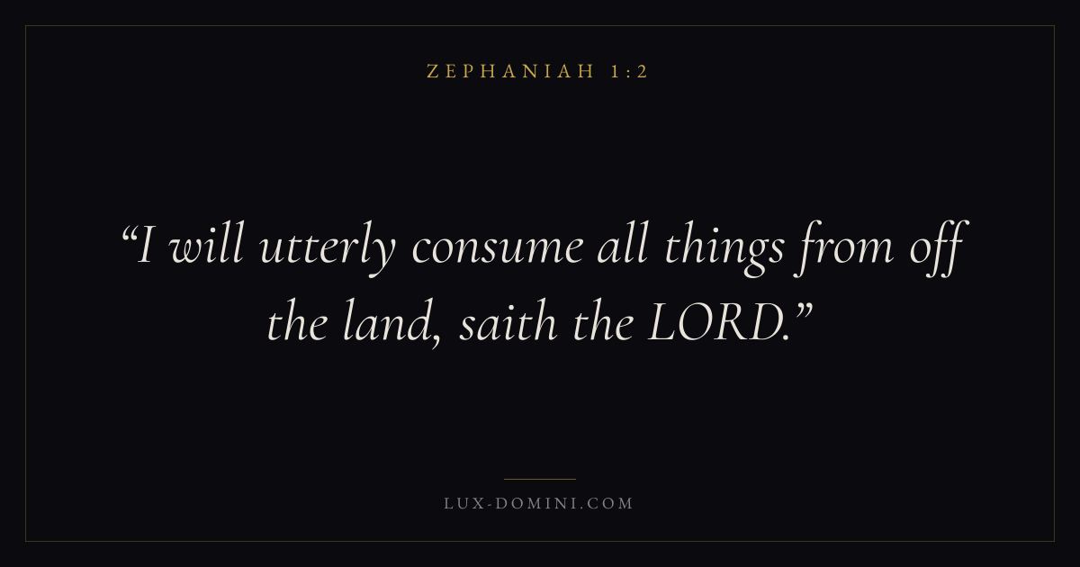 Books / Zephaniah / Chapter 1 / Verse 2 ← Zephaniah 1:1 Zephaniah 1:2 Zephaniah 1:3 → I will utterly consume all things from off the land, saith the LORD. Download verse card Share on Twitter Share on Facebook Pin it ✦ Key themes Justice and mercyPeaceHumilityDay of the Lord Read with Zephaniah 1:1Zephaniah 1:3Micah 6:8Amos 5:24 Related topics Bible verses about justice and mercyBible verses about peaceBible verses about humility ✦ Zephaniah Chapter 1 verses V. 1 V. 2 V. 3 V. 4 V. 5 V. 6 V. 7 V. 8 V. 9 V. 10 V. 11 V. 12 V. 13 V. 14 V. 15 V. 16 V. 17 V. 18