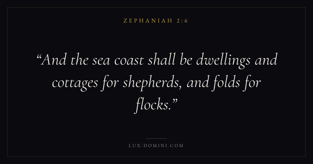 Books / Zephaniah / Chapter 2 / Verse 6 ← Zephaniah 2:5 Zephaniah 2:6 Zephaniah 2:7 → And the sea coast shall be dwellings and cottages for shepherds, and folds for flocks. Download verse card Share on Twitter Share on Facebook Pin it ✦ Key themes Justice and mercyHumilityTruthDay of the Lord Read with Zephaniah 2:4Zephaniah 2:5Micah 6:8Amos 5:24 Related topics Bible verses about justice and mercyBible verses about humilityBible verses about truth ✦ Zephaniah Chapter 2 verses V. 1 V. 2 V. 3 V. 4 V. 5 V. 6 V. 7 V. 8 V. 9 V. 10 V. 11 V. 12 V. 13 V. 14 V. 15