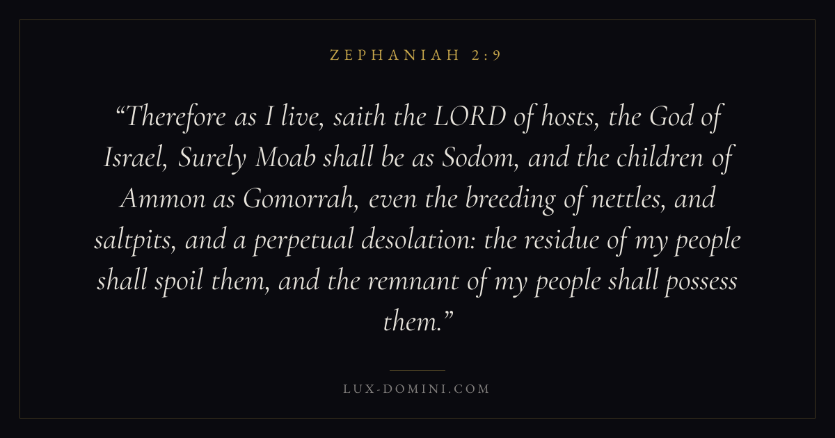 Therefore as I live, saith the LORD of hosts, the God of Israel, Surely Moab shall be as Sodom, and the children of Ammon as Gomorrah, even the breeding of nettles, and saltpits, and a perpetual desolation: the residue of my people shall spoil them, and the remnant of my people shall possess them.