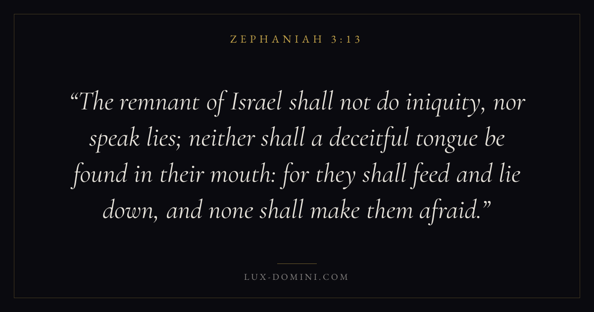 The remnant of Israel shall not do iniquity, nor speak lies; neither shall a deceitful tongue be found in their mouth: for they shall feed and lie down, and none shall make them afraid.
