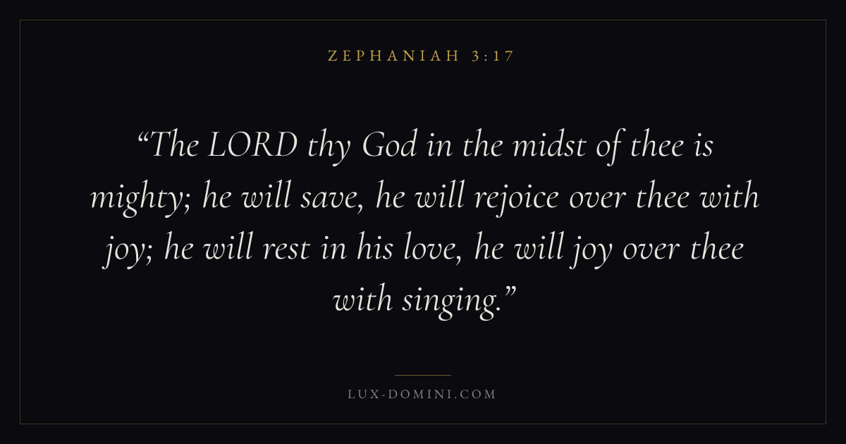 The LORD thy God in the midst of thee is mighty; he will save, he will rejoice over thee with joy; he will rest in his love, he will joy over thee with singing.