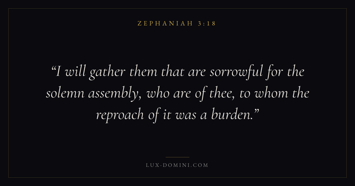 I will gather them that are sorrowful for the solemn assembly, who are of thee, to whom the reproach of it was a burden.