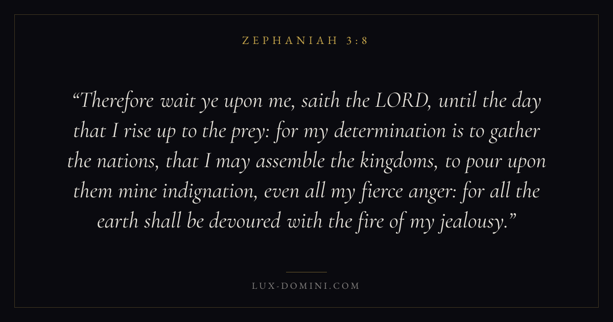Therefore wait ye upon me, saith the LORD, until the day that I rise up to the prey: for my determination is to gather the nations, that I may assemble the kingdoms, to pour upon them mine indignation, even all my fierce anger: for all the earth shall be devoured with the fire of my jealousy.